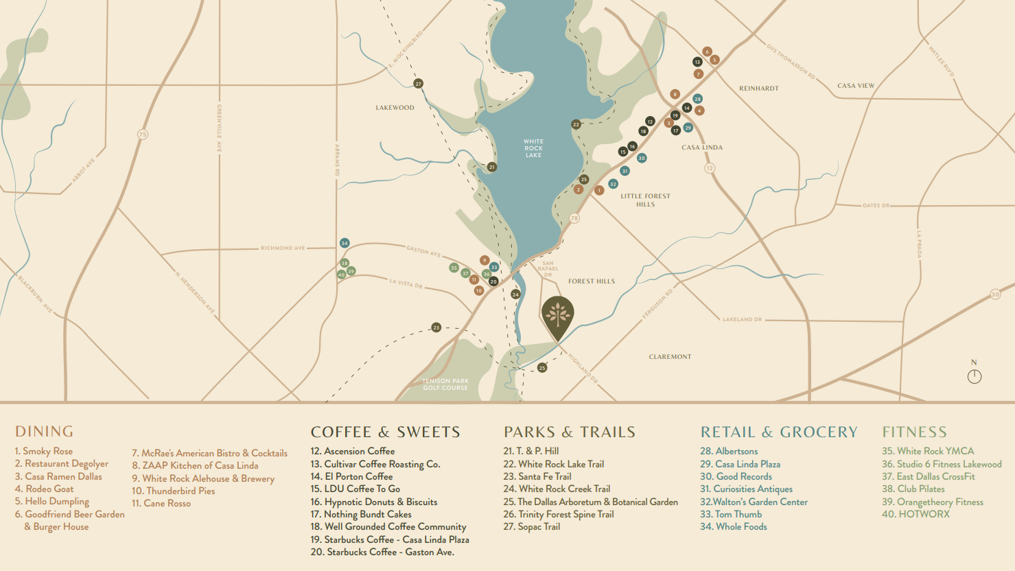 Located south of White Rock Lake in Dallas, this residential area offers a blend of green spaces and urban accessibility. Residents can enjoy proximity to the lake's recreational trails, suitable for jogging and walking, as well as several nearby golf courses and boat docks. The area provides access to a variety of dining options, ranging from casual to upscale establishments. Cultural amenities include local galleries and boutiques, contributing to the area's diverse offerings. The location balances natural surroundings with convenient access to Dallas's urban environment.
